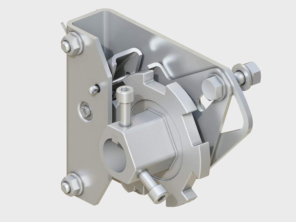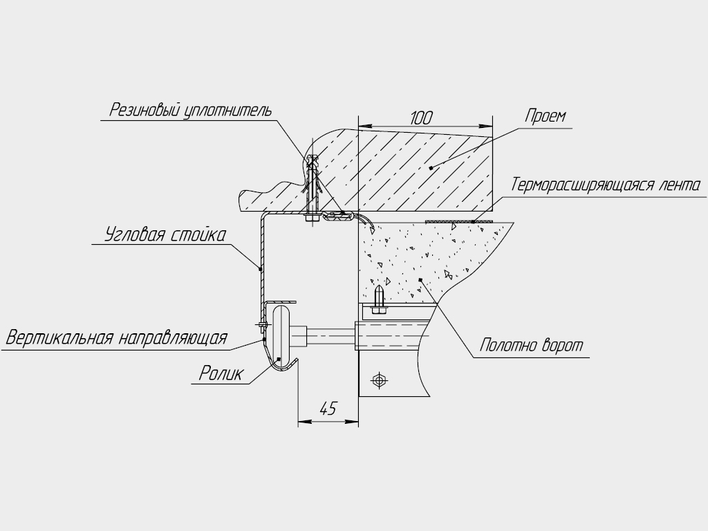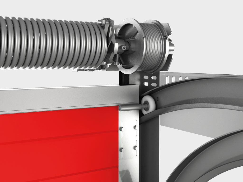 Монтаж противопожарных ворот осуществляется стандартным накладным способом – система направляющих монтируется внутри проема, торсионный механизм размещается сверху над проемом. Используется усиленный торсионный механизм на 25000 циклов открытия (опционально – 50000 циклов), усиленный вал ворот.